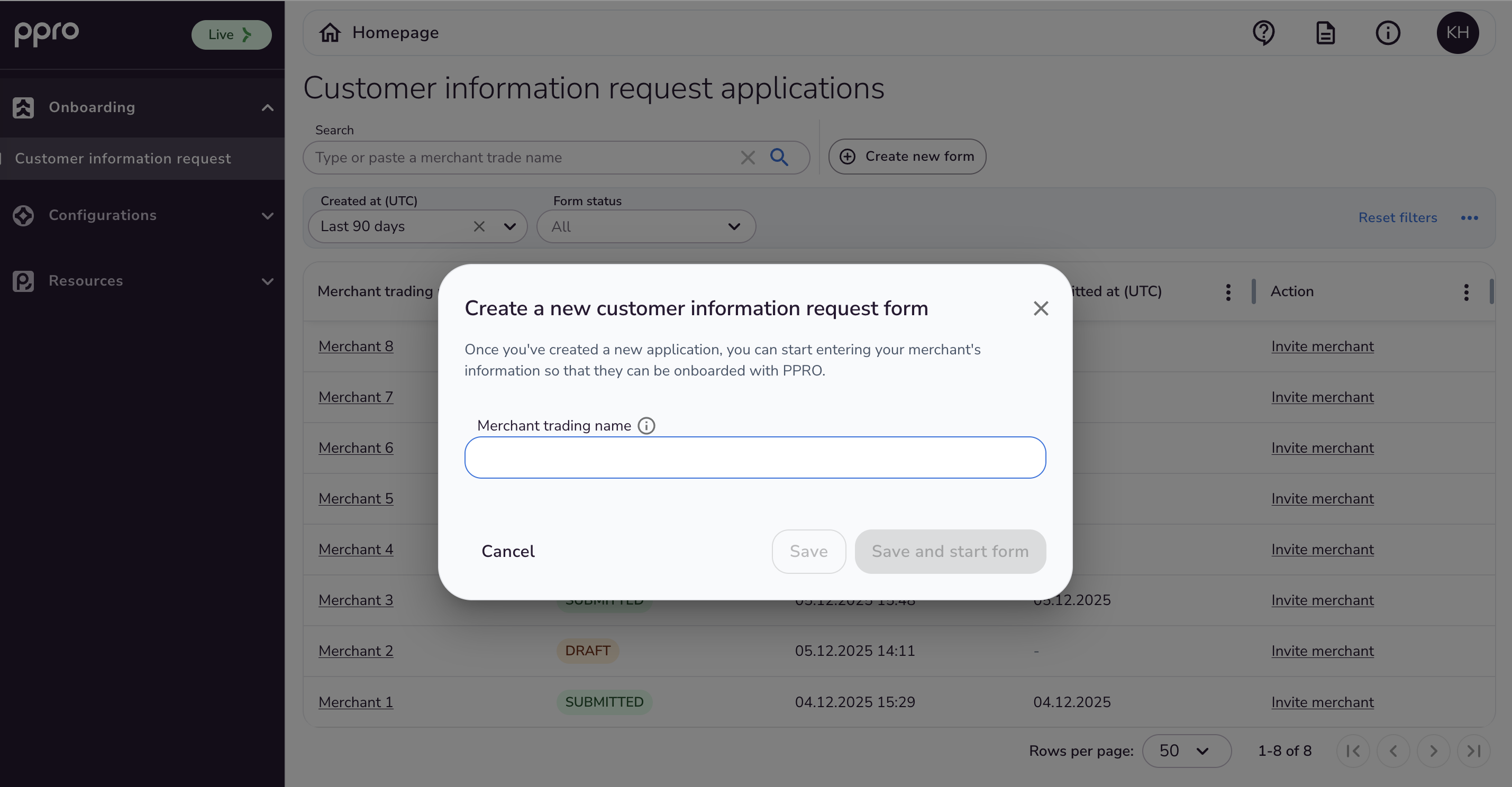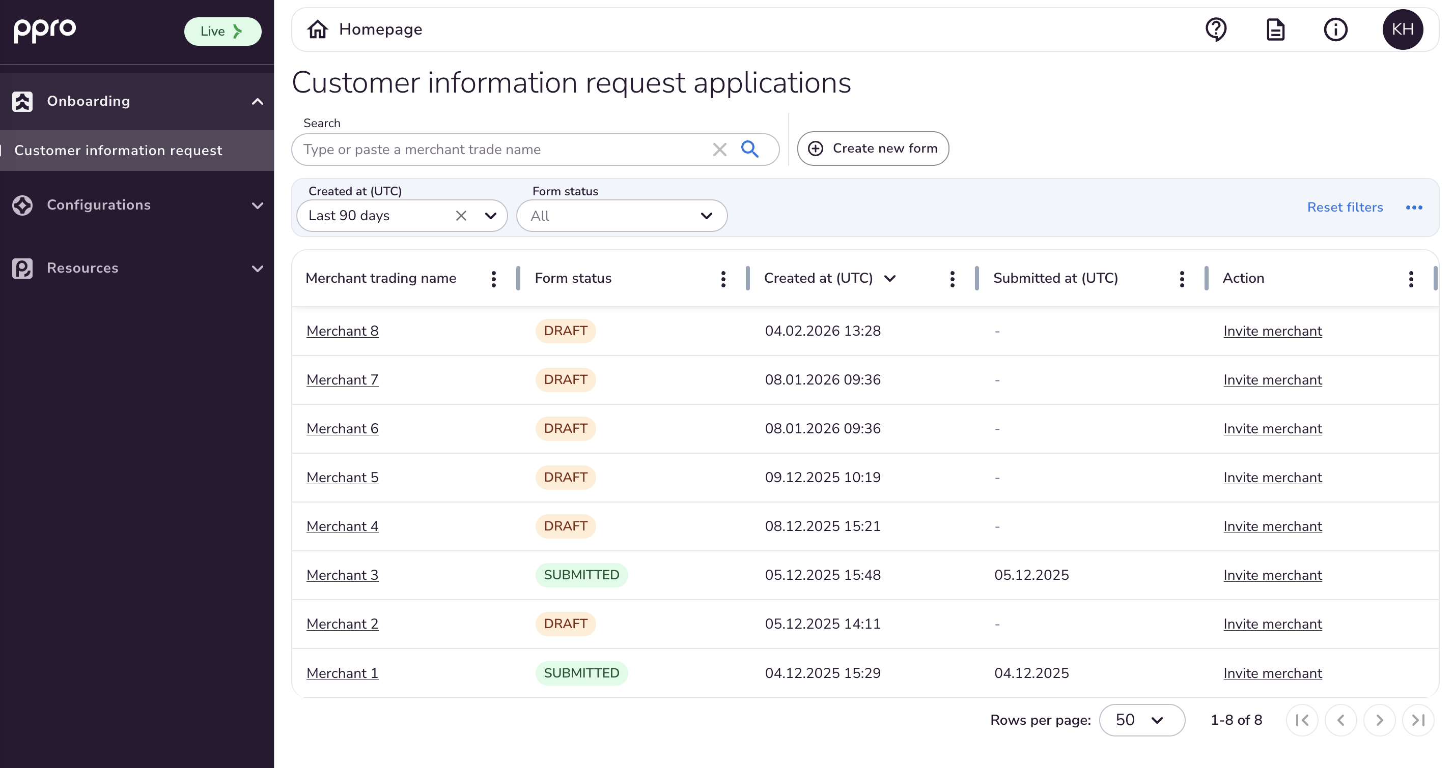 Inviting a merchant to fill out the PPRO Customer Information Request form